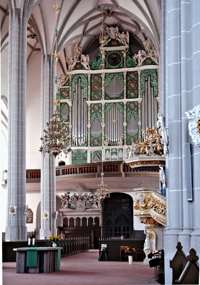 Organ (Sonnenorgel) by Eugen and Horatio Casparini, 1703 (reconstr. 1999), 4 manuals, 89 stops - Bach pupil Nicolai worked here.